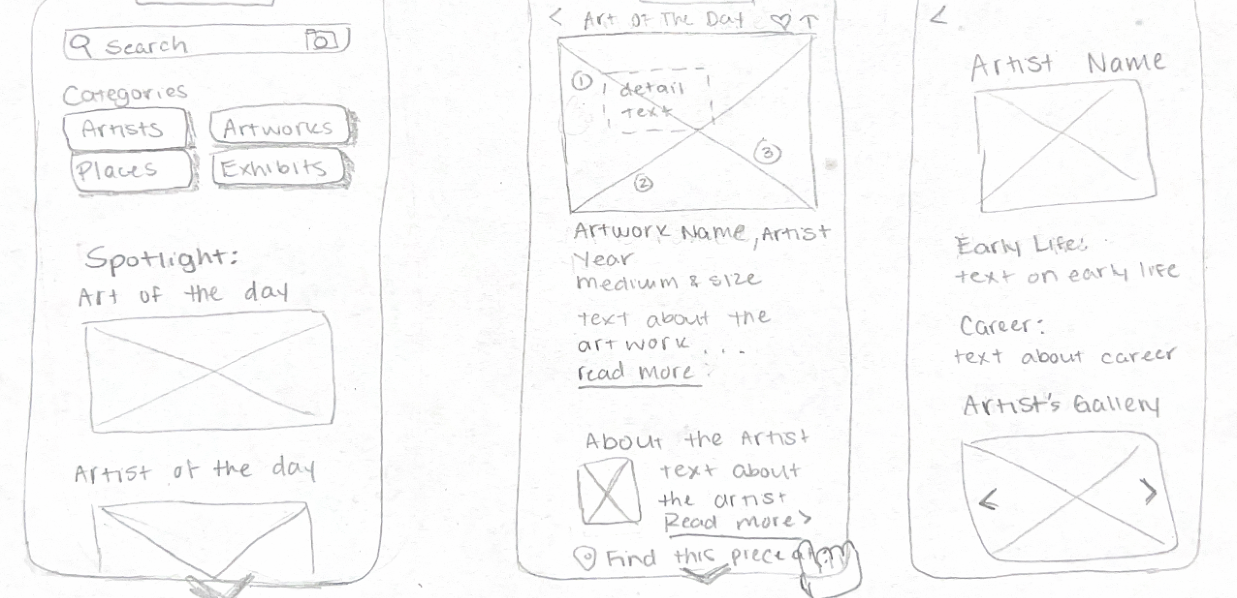 I used the crazy 8s method to come up with some possible solutions. The majority of users during the user interviews said what would make their museum or gallery experience better was if they knew more information on the artists and the specific art pieces. For this reason, I thought this screen was the most critical to sketch different variations of.