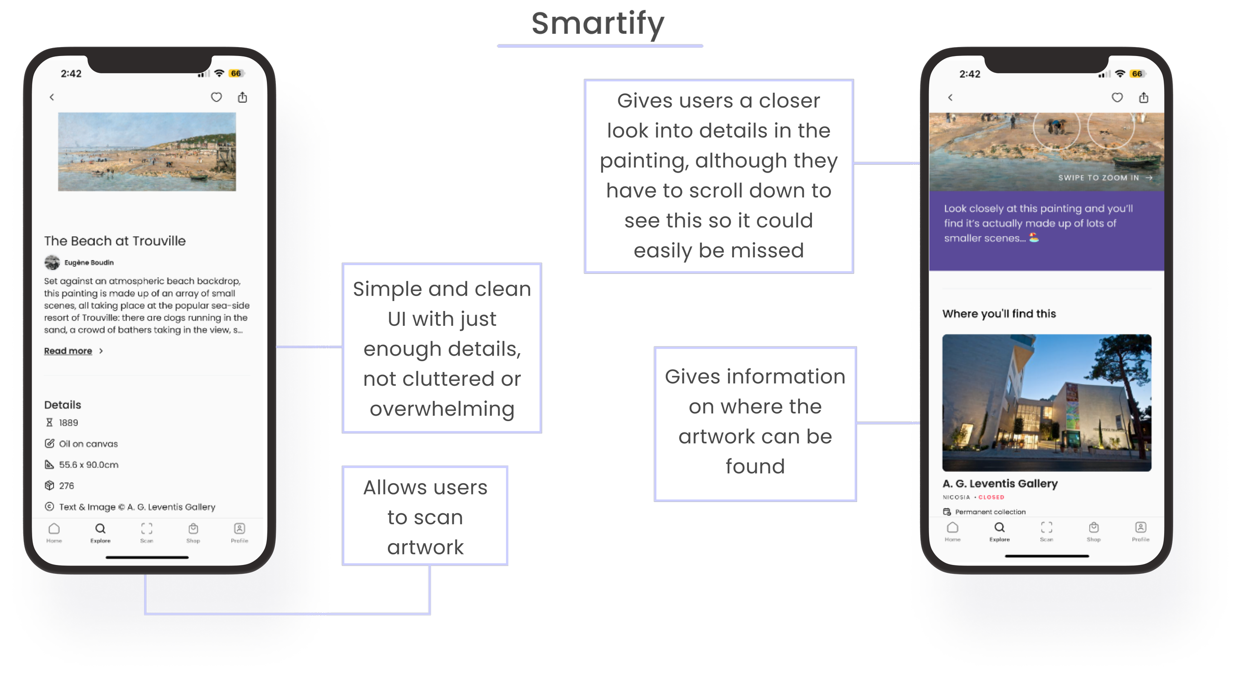 I thought it was important to focus on a solution that would provide quick and thorough results. Being able to scan a piece of artwork would allow the user to quickly read on that piece, gaining just enough insight quickly. If they want more information, they can go to the artworks page and/or the artists page and read more information. Because I felt this was more in line with Angela’s goals, I decided to move forward with the first map.