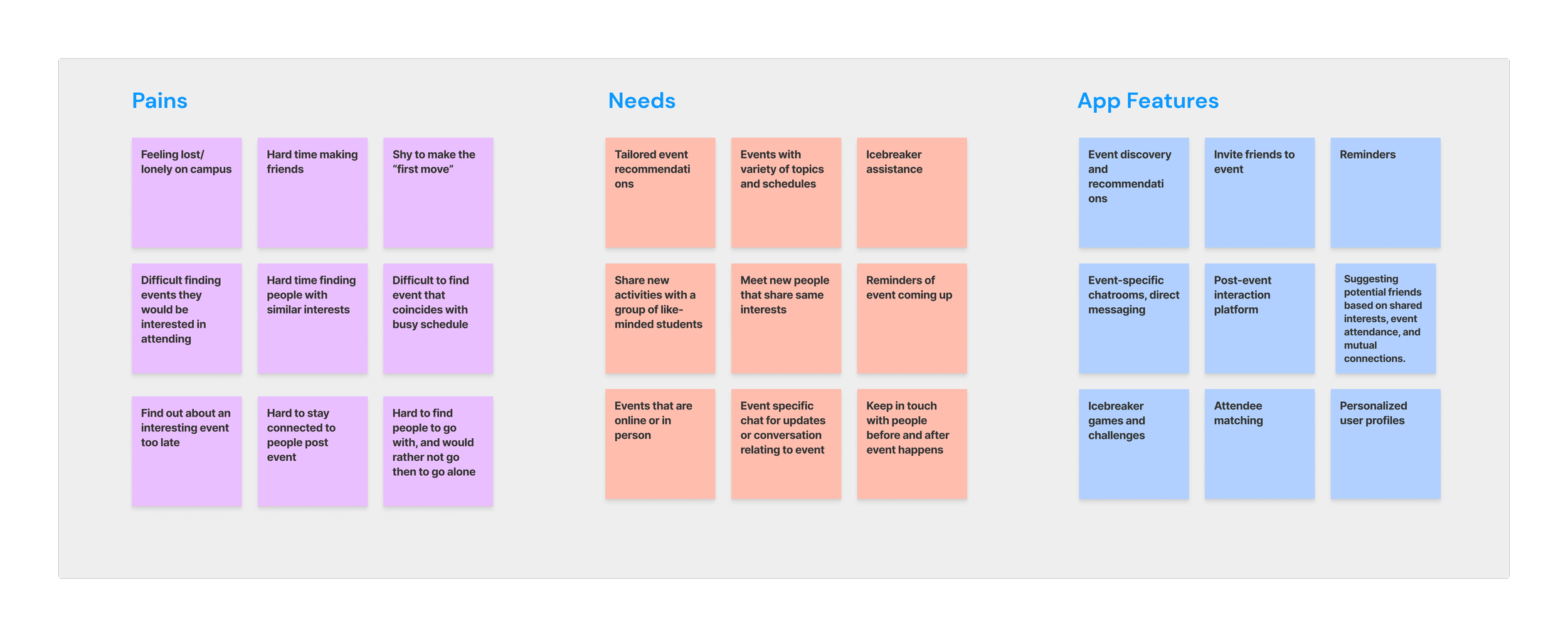 With all the information we collected from the discovery phase, we created an affinity map to help organize the common themes that came up in our research into 3 main categories: needs, pains, and app features. We highlighted the main points to keep in mind in each category as we move forward with ideation and design.