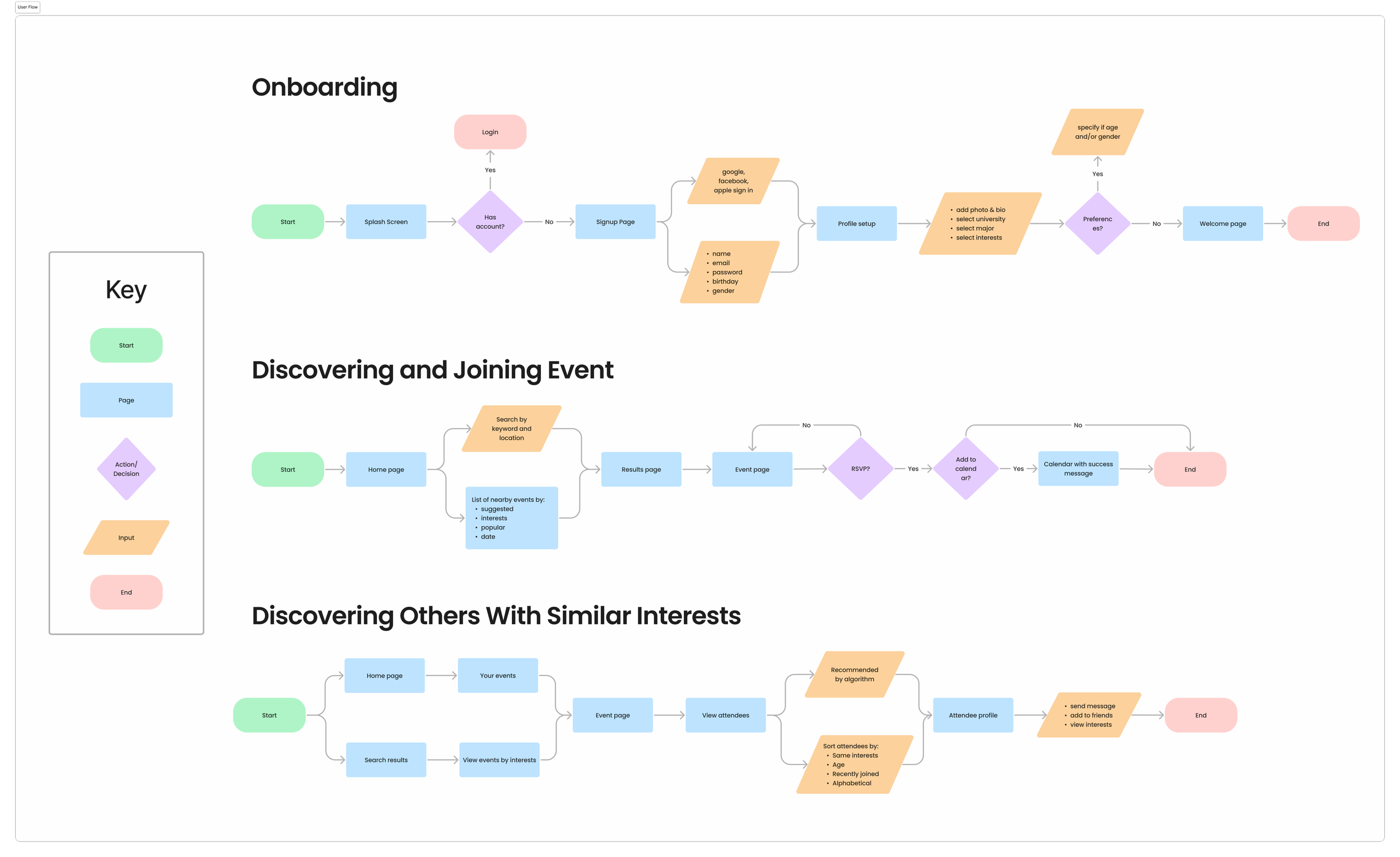 With a deeper understanding of what the users want, what the client wants, and the direction we were going to take for this design, we created 3 user flows that we felt were necessary to focus on with our limited time- onboarding, discovering and joining an event, and discovering peers with similar interests.
